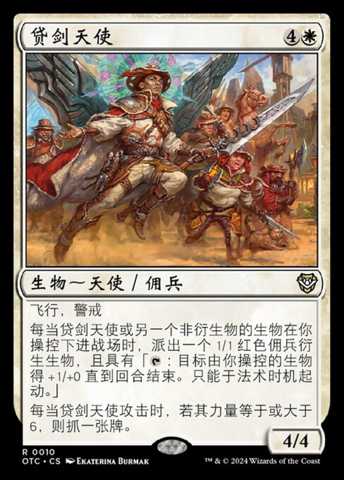 | Rules | Flying, vigilance Whenever Angelic Sell-Sword or another nontoken creature enters the battlefield under your control, create a 1/1 red Mercenary creature token with ": Target creature you control gets +1/+0 until end of turn. Activate only as a sorcery." Whenever Angelic Sell-Sword attacks, if its power is 6 or greater, draw a card. |
