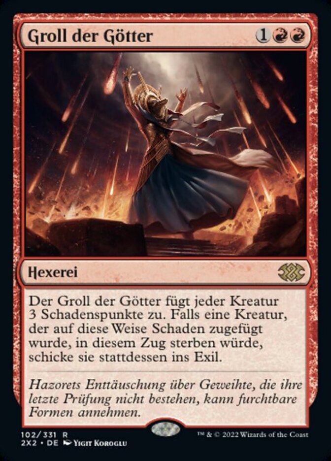 | Rules | Anger of the Gods deals 3 damage to each creature. If a creature dealt damage this way would die this turn, exile it instead. |