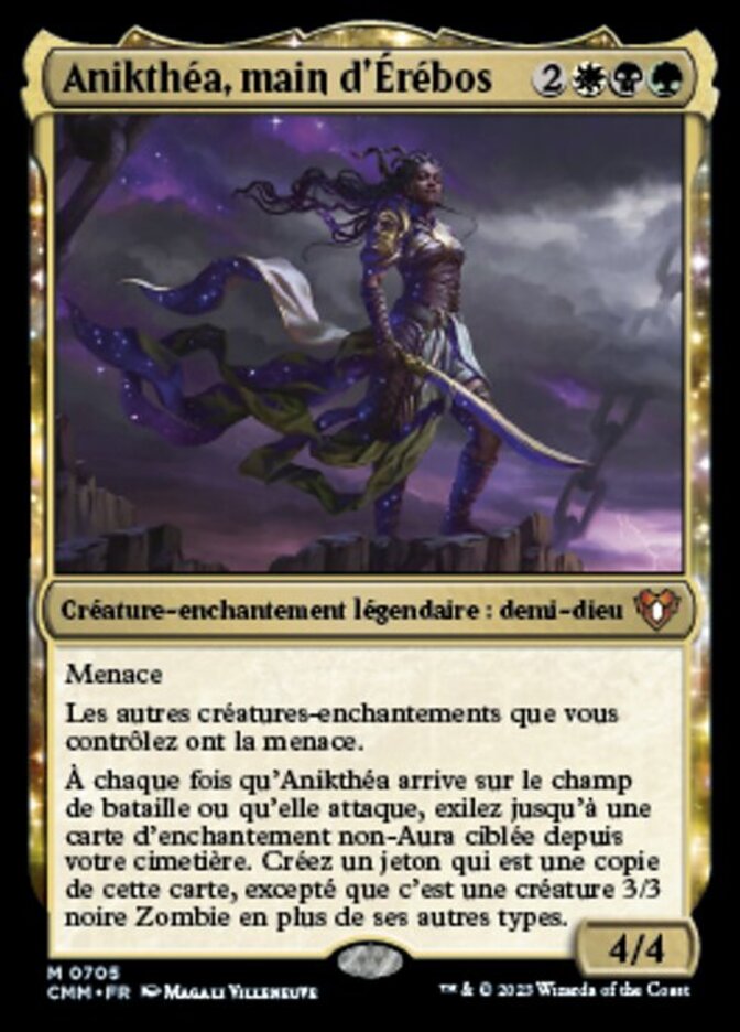 | Rules | Menace Other enchantment creatures you control have menace. Whenever Anikthea enters the battlefield or attacks, exile up to one target non-Aura enchantment card from your graveyard. Create a token that's a copy of that card, except it's a 3/3 black Zombie creature in addition to its other types. |