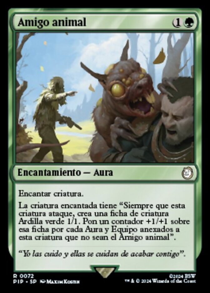 | Rules | Enchant creature Enchanted creature has "Whenever this creature attacks, create a 1/1 green Squirrel creature token. Put a +1/+1 counter on that token for each Aura and Equipment attached to this creature other than Animal Friend." |