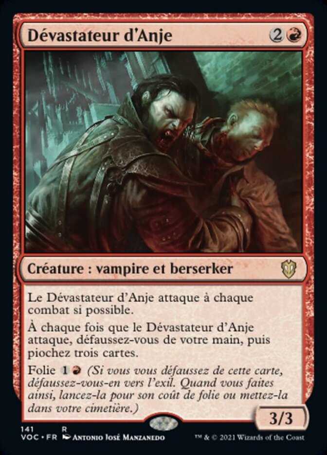 | Rules | Anje's Ravager attacks each combat if able. Whenever Anje's Ravager attacks, discard your hand, then draw three cards. Madness (If you discard this card, discard it into exile. When you do, cast it for its madness cost or put it into your graveyard.) |