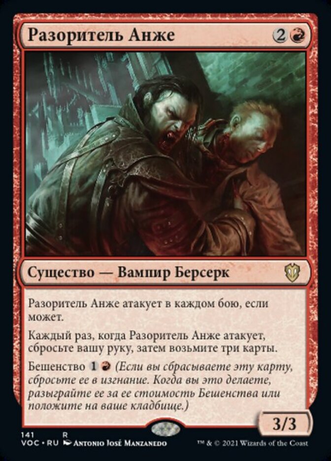 | Rules | Anje's Ravager attacks each combat if able. Whenever Anje's Ravager attacks, discard your hand, then draw three cards. Madness (If you discard this card, discard it into exile. When you do, cast it for its madness cost or put it into your graveyard.) |
