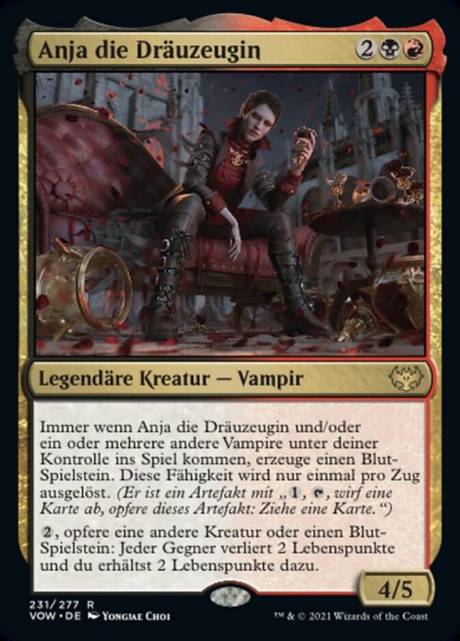 | Rules | Whenever Anje, Maid of Dishonor and/or one or more other Vampires enter the battlefield under your control, create a Blood token. This ability triggers only once each turn. (It's an artifact with ", , Discard a card, Sacrifice this artifact: Draw a card.") , Sacrifice another creature or a Blood token: Each opponent loses 2 life and you gain 2 life. |