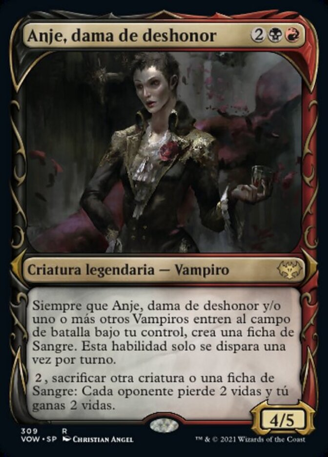 | Rules | Whenever Anje, Maid of Dishonor and/or one or more other Vampires enter the battlefield under your control, create a Blood token. This ability triggers only once each turn. (It's an artifact with ", , Discard a card, Sacrifice this artifact: Draw a card.") , Sacrifice another creature or a Blood token: Each opponent loses 2 life and you gain 2 life. |