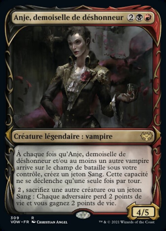 | Rules | Whenever Anje, Maid of Dishonor and/or one or more other Vampires enter the battlefield under your control, create a Blood token. This ability triggers only once each turn. (It's an artifact with ", , Discard a card, Sacrifice this artifact: Draw a card.") , Sacrifice another creature or a Blood token: Each opponent loses 2 life and you gain 2 life. |