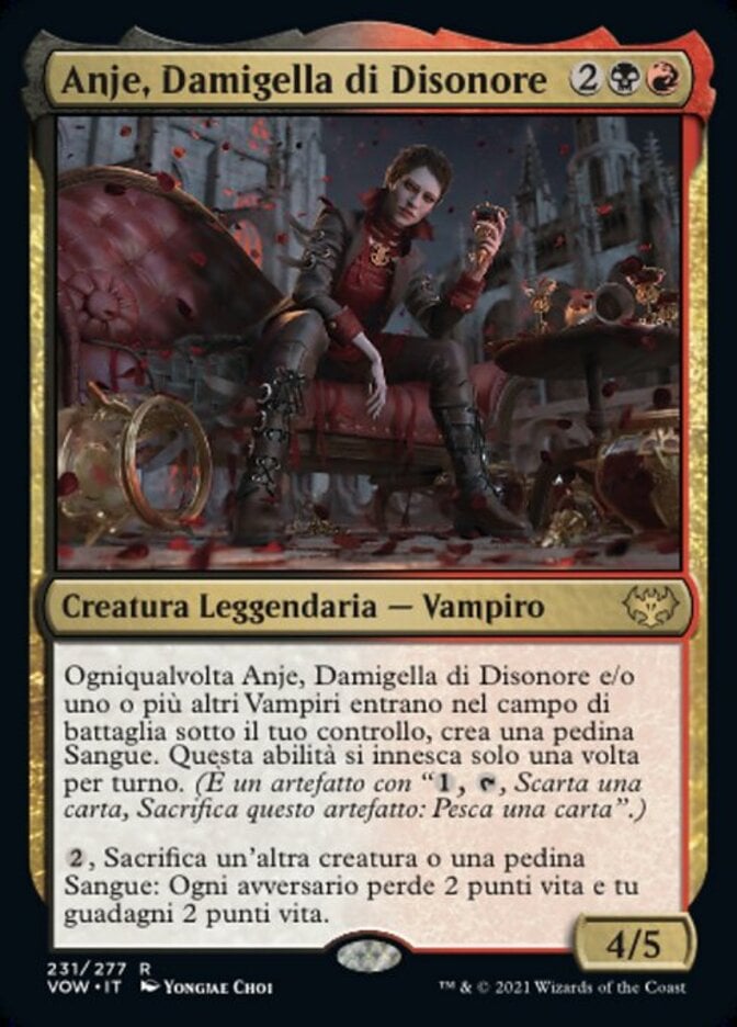 | Rules | Whenever Anje, Maid of Dishonor and/or one or more other Vampires enter the battlefield under your control, create a Blood token. This ability triggers only once each turn. (It's an artifact with ", , Discard a card, Sacrifice this artifact: Draw a card.") , Sacrifice another creature or a Blood token: Each opponent loses 2 life and you gain 2 life. |