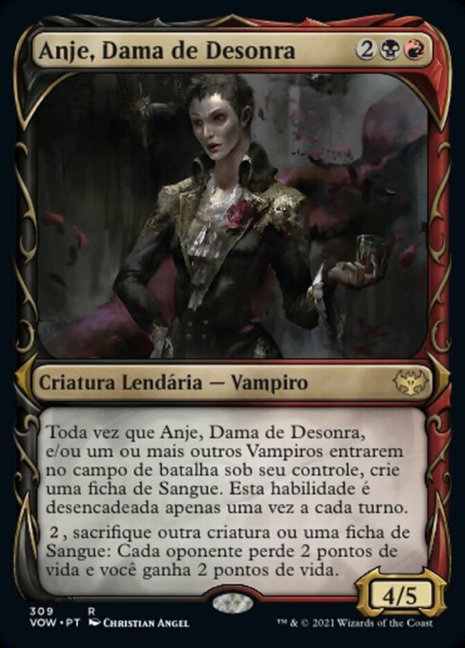 | Rules | Whenever Anje, Maid of Dishonor and/or one or more other Vampires enter the battlefield under your control, create a Blood token. This ability triggers only once each turn. (It's an artifact with ", , Discard a card, Sacrifice this artifact: Draw a card.") , Sacrifice another creature or a Blood token: Each opponent loses 2 life and you gain 2 life. |