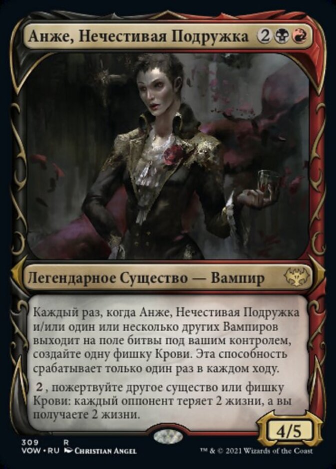 | Rules | Whenever Anje, Maid of Dishonor and/or one or more other Vampires enter the battlefield under your control, create a Blood token. This ability triggers only once each turn. (It's an artifact with ", , Discard a card, Sacrifice this artifact: Draw a card.") , Sacrifice another creature or a Blood token: Each opponent loses 2 life and you gain 2 life. |
