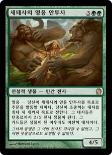 | Rules | Heroic — Whenever you cast a spell that targets Anthousa, Setessan Hero, up to three target lands you control each become 2/2 Warrior creatures until end of turn. They're still lands. |