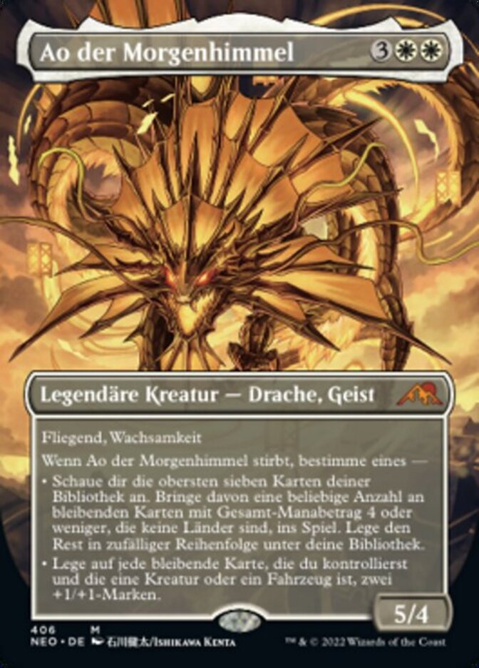 | Rules | Flying, vigilance When Ao, the Dawn Sky dies, choose one — • Look at the top seven cards of your library. Put any number of nonland permanent cards with total mana value 4 or less from among them onto the battlefield. Put the rest on the bottom of your library in a random order. • Put two +1/+1 counters on each permanent you control that's a creature or Vehicle. |