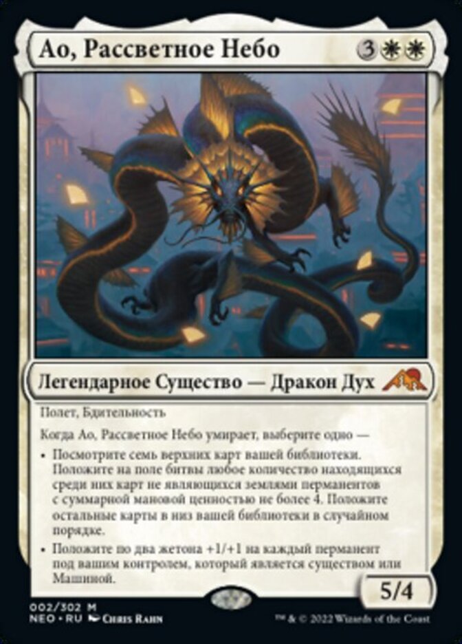 | Rules | Flying, vigilance When Ao, the Dawn Sky dies, choose one — • Look at the top seven cards of your library. Put any number of nonland permanent cards with total mana value 4 or less from among them onto the battlefield. Put the rest on the bottom of your library in a random order. • Put two +1/+1 counters on each permanent you control that's a creature or Vehicle. |