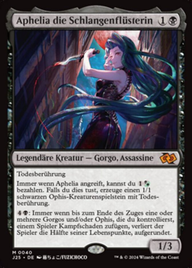 | Rules | Deathtouch Whenever Aphelia attacks, you may pay . If you do, create a 1/1 black Snake creature token with deathtouch. : Until end of turn, whenever one or more Gorgons and/or Snakes you control deal combat damage to a player, that player loses half their life, rounded up. |