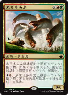 | Rules | Apocalypse Hydra enters the battlefield with X +1/+1 counters on it. If X is 5 or more, it enters the battlefield with an additional X +1/+1 counters on it. , Remove a +1/+1 counter from Apocalypse Hydra: It deals 1 damage to any target. |