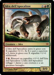 | Rules | Apocalypse Hydra enters the battlefield with X +1/+1 counters on it. If X is 5 or more, it enters the battlefield with an additional X +1/+1 counters on it. , Remove a +1/+1 counter from Apocalypse Hydra: It deals 1 damage to any target. |