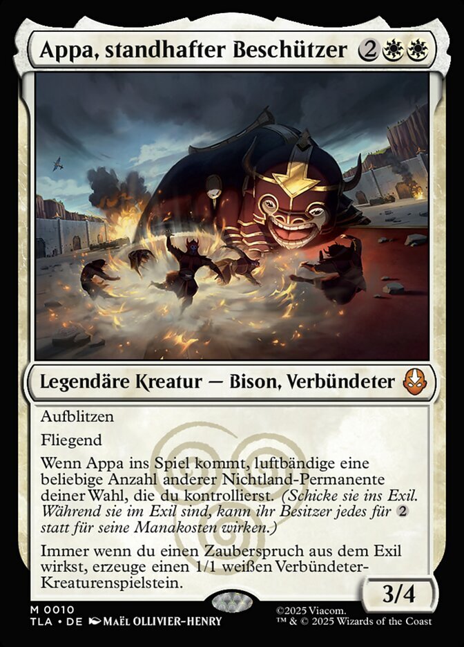 | Rules | Flash Flying When Appa enters, airbend any number of other target nonland permanents you control. (Exile them. While each one is exiled, its owner may cast it for rather than its mana cost.) Whenever you cast a spell from exile, create a 1/1 white Ally creature token. |