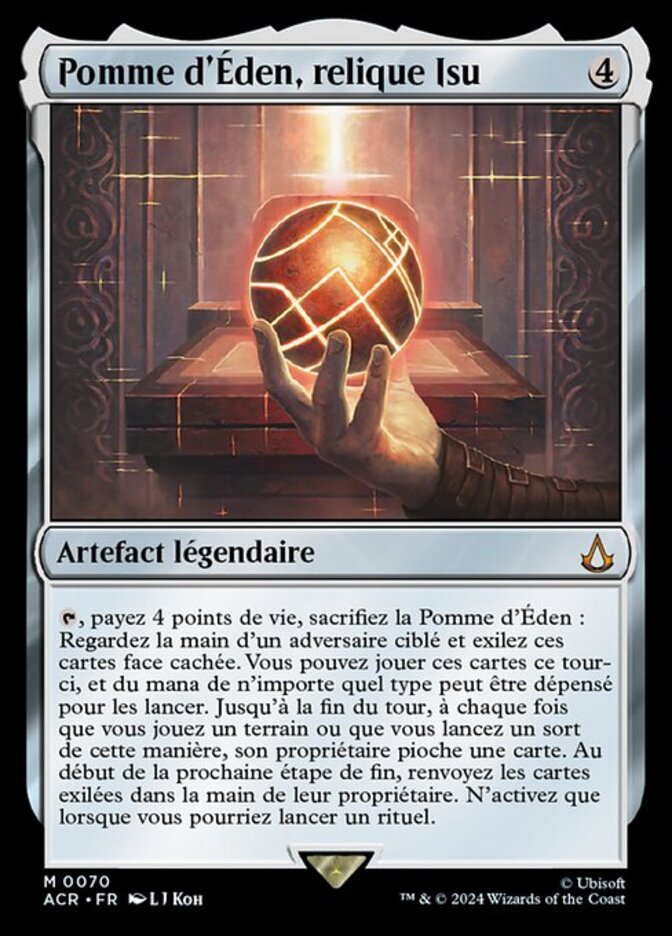 | Rules | , Pay 4 life, Sacrifice Apple of Eden: Look at target opponent's hand and exile those cards face down. You may play those cards this turn, and mana of any type can be spent to cast them. Until end of turn, whenever you play a land or cast a spell this way, its owner draws a card. At the beginning of the next end step, return the exiled cards to their owner's hand. Activate only as a sorcery. |