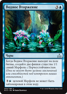 | Rules | When Aquatic Incursion enters the battlefield, create two 1/1 blue Merfolk creature tokens with hexproof. (They can't be the targets of spells or abilities your opponents control.) : Target Merfolk can't be blocked this turn. |