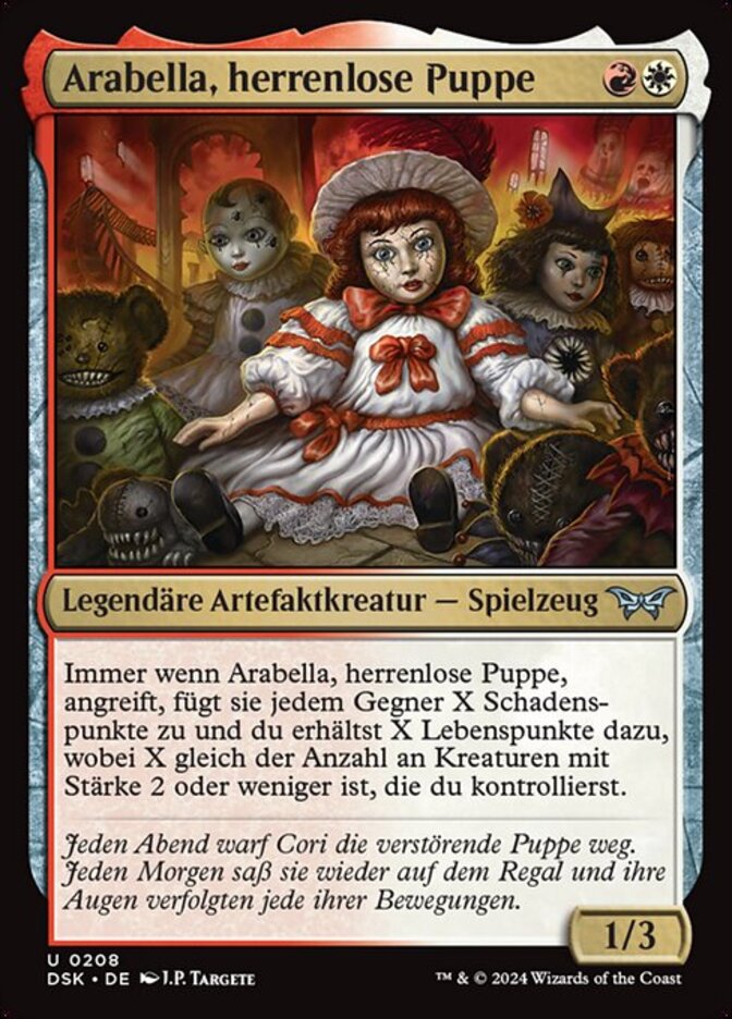 | Rules | Whenever Arabella, Abandoned Doll attacks, it deals X damage to each opponent and you gain X life, where X is the number of creatures you control with power 2 or less. |