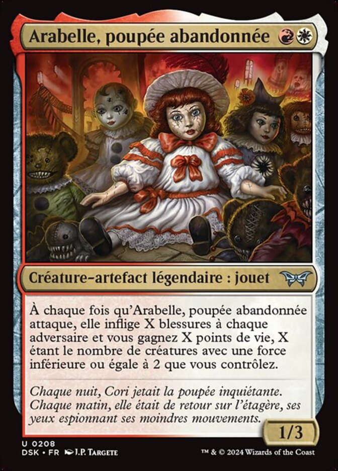 | Rules | Whenever Arabella, Abandoned Doll attacks, it deals X damage to each opponent and you gain X life, where X is the number of creatures you control with power 2 or less. |