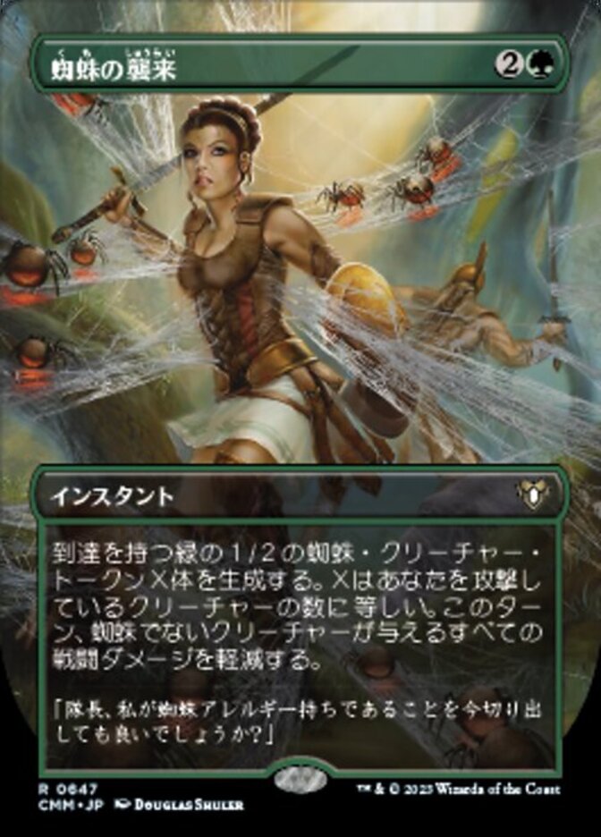 | Rules | Create X 1/2 green Spider creature tokens with reach, where X is the number of creatures attacking you. Prevent all combat damage that would be dealt this turn by non-Spider creatures. |