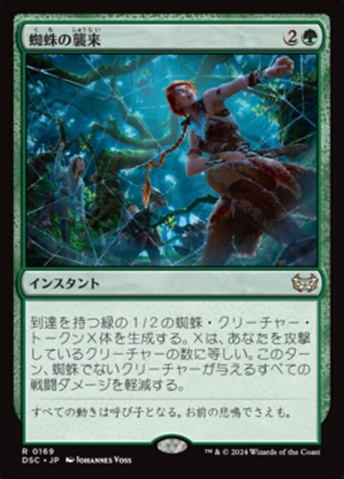 | Rules | Create X 1/2 green Spider creature tokens with reach, where X is the number of creatures attacking you. Prevent all combat damage that would be dealt this turn by non-Spider creatures. |
