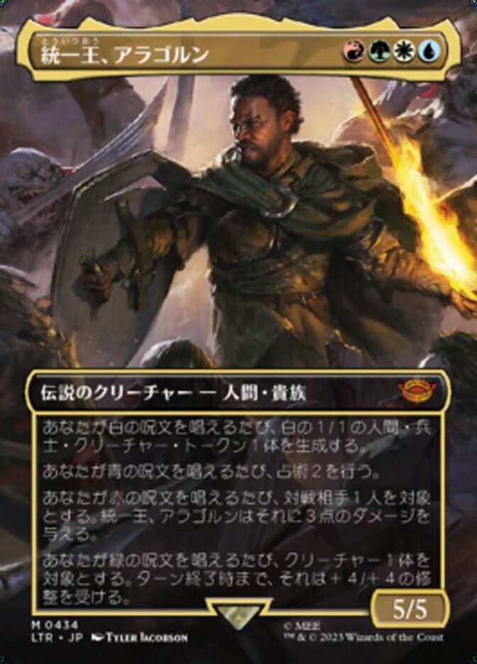 | Rules | Whenever you cast a white spell, create a 1/1 white Human Soldier creature token. Whenever you cast a blue spell, scry 2. Whenever you cast a red spell, Aragorn, the Uniter deals 3 damage to target opponent. Whenever you cast a green spell, target creature gets +4/+4 until end of turn. |