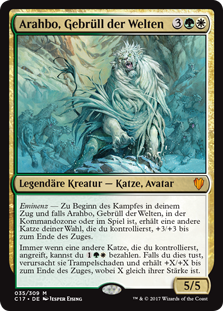 | Rules | Eminence — At the beginning of combat on your turn, if Arahbo, Roar of the World is in the command zone or on the battlefield, another target Cat you control gets +3/+3 until end of turn. Whenever another Cat you control attacks, you may pay . If you do, it gains trample and gets +X/+X until end of turn, where X is its power. |