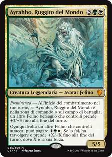 | Rules | Eminence — At the beginning of combat on your turn, if Arahbo, Roar of the World is in the command zone or on the battlefield, another target Cat you control gets +3/+3 until end of turn. Whenever another Cat you control attacks, you may pay . If you do, it gains trample and gets +X/+X until end of turn, where X is its power. |