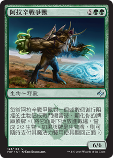 | Rules | Whenever Arashin War Beast deals combat damage to one or more blocking creatures, manifest the top card of your library. (Put it onto the battlefield face down as a 2/2 creature. Turn it face up any time for its mana cost if it's a creature card.) |