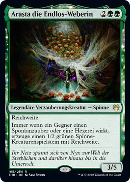 | Rules | Reach Whenever an opponent casts an instant or sorcery spell, create a 1/2 green Spider creature token with reach. |