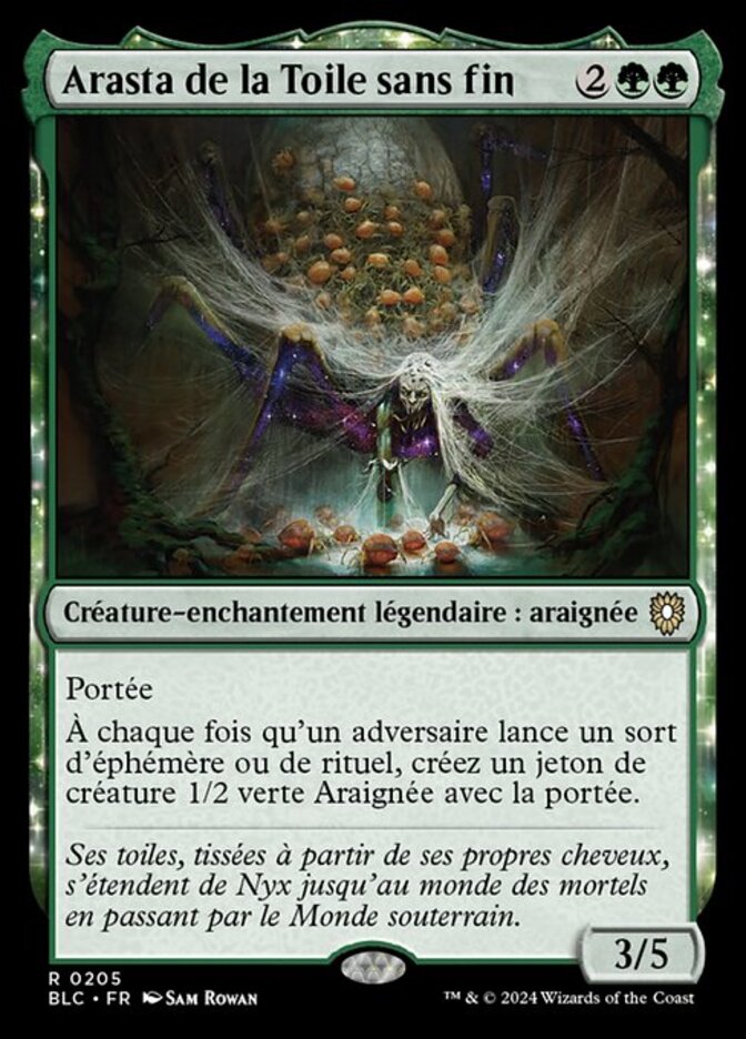 | Rules | Reach Whenever an opponent casts an instant or sorcery spell, create a 1/2 green Spider creature token with reach. |
