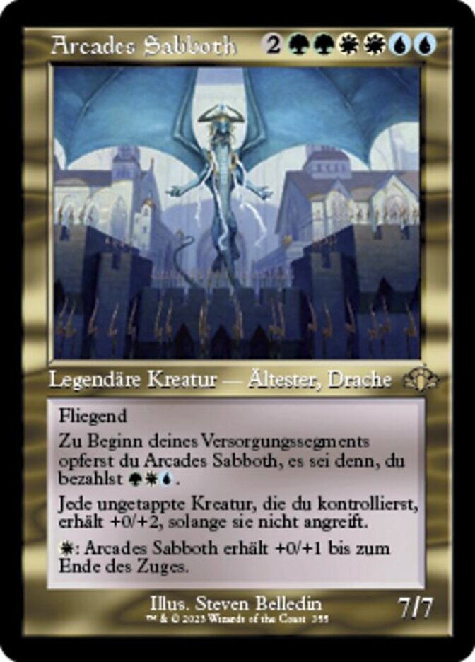 | Rules | Flying At the beginning of your upkeep, sacrifice Arcades Sabboth unless you pay . Each untapped creature you control gets +0/+2 as long as it's not attacking. : Arcades Sabboth gets +0/+1 until end of turn. |