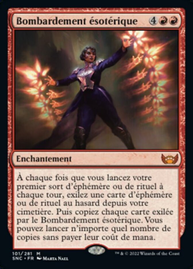 | Rules | Whenever you cast your first instant or sorcery spell each turn, exile an instant or sorcery card at random from your graveyard. Then copy each card exiled with Arcane Bombardment. You may cast any number of the copies without paying their mana costs. |