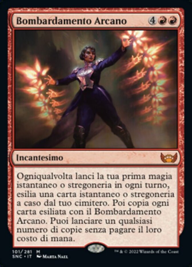 | Rules | Whenever you cast your first instant or sorcery spell each turn, exile an instant or sorcery card at random from your graveyard. Then copy each card exiled with Arcane Bombardment. You may cast any number of the copies without paying their mana costs. |