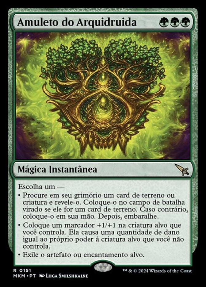 | Rules | Choose one — • Search your library for a creature or land card and reveal it. Put it onto the battlefield tapped if it's a land card. Otherwise, put it into your hand. Then shuffle. • Put a +1/+1 counter on target creature you control. It deals damage equal to its power to target creature you don't control. • Exile target artifact or enchantment. |