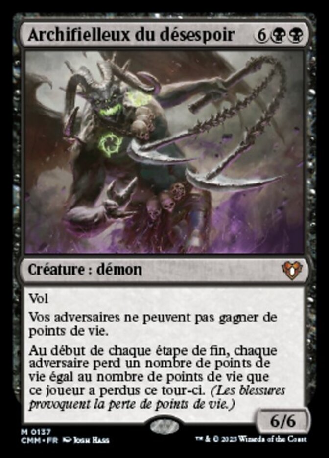 | Rules | Flying Your opponents can't gain life. At the beginning of each end step, each opponent loses life equal to the life that player lost this turn. (Damage causes loss of life.) |