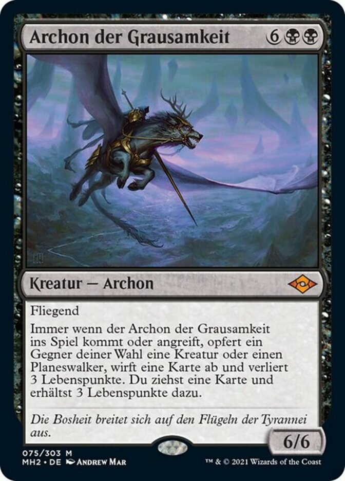 | Rules | Flying Whenever Archon of Cruelty enters the battlefield or attacks, target opponent sacrifices a creature or planeswalker, discards a card, and loses 3 life. You draw a card and gain 3 life. |