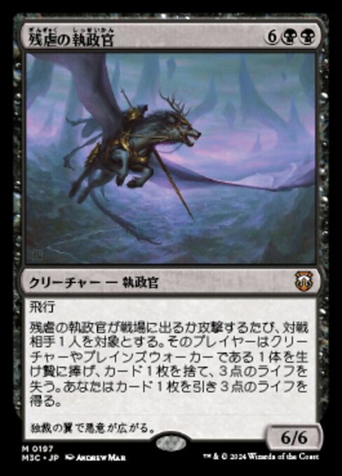 | Rules | Flying Whenever Archon of Cruelty enters the battlefield or attacks, target opponent sacrifices a creature or planeswalker, discards a card, and loses 3 life. You draw a card and gain 3 life. |
