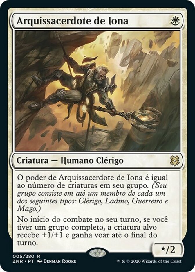 | Rules | Archpriest of Iona's power is equal to the number of creatures in your party. (Your party consists of up to one each of Cleric, Rogue, Warrior, and Wizard.) At the beginning of combat on your turn, if you have a full party, target creature gets +1/+1 and gains flying until end of turn. |