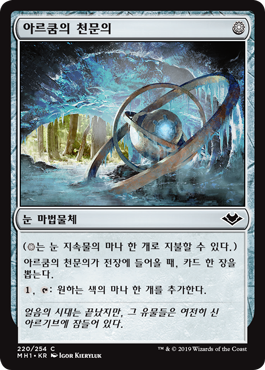 | Rules | ( can be paid with one mana from a snow source.) When Arcum's Astrolabe enters the battlefield, draw a card. , : Add one mana of any color. |