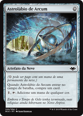 | Rules | ( can be paid with one mana from a snow source.) When Arcum's Astrolabe enters the battlefield, draw a card. , : Add one mana of any color. |
