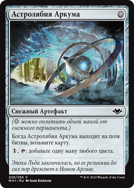 | Rules | ( can be paid with one mana from a snow source.) When Arcum's Astrolabe enters the battlefield, draw a card. , : Add one mana of any color. |