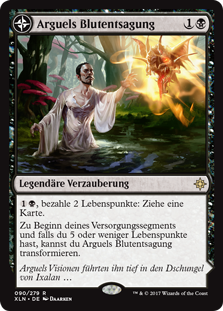 | Rules | , Pay 2 life: Draw a card. At the beginning of your upkeep, if you have 5 or less life, you may transform Arguel's Blood Fast. // (Transforms from Arguel's Blood Fast.) : Add . , Sacrifice a creature: You gain life equal to the sacrificed creature's toughness. |