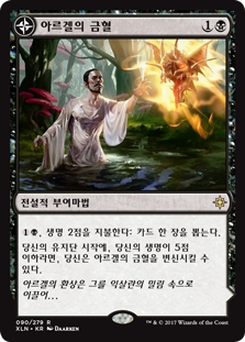 | Rules | , Pay 2 life: Draw a card. At the beginning of your upkeep, if you have 5 or less life, you may transform Arguel's Blood Fast. // (Transforms from Arguel's Blood Fast.) : Add . , Sacrifice a creature: You gain life equal to the sacrificed creature's toughness. |