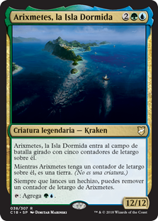 | Rules | Arixmethes, Slumbering Isle enters the battlefield tapped with five slumber counters on it. As long as Arixmethes has a slumber counter on it, it's a land. (It's not a creature.) Whenever you cast a spell, you may remove a slumber counter from Arixmethes. : Add . |