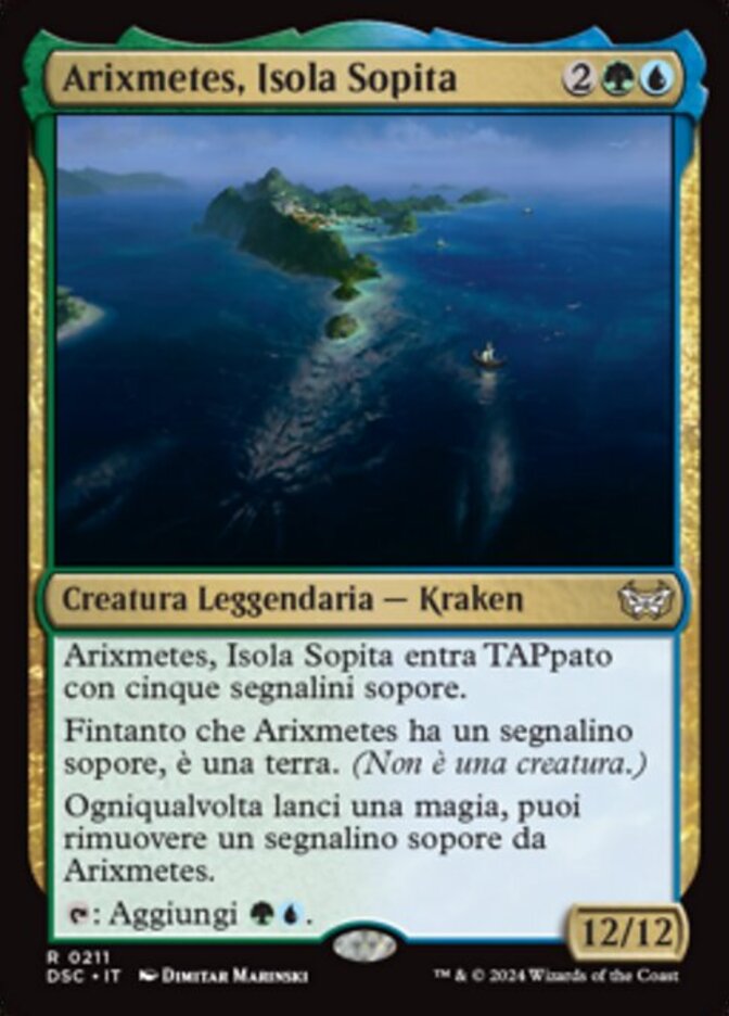 | Rules | Arixmethes, Slumbering Isle enters the battlefield tapped with five slumber counters on it. As long as Arixmethes has a slumber counter on it, it's a land. (It's not a creature.) Whenever you cast a spell, you may remove a slumber counter from Arixmethes. : Add . |