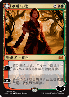| Rules | +1: Until end of turn, up to one target creature gets +2/+2 and gains vigilance and haste. 0: Create a 2/2 green Wolf creature token. Transform Arlinn Kord. // +1: Creatures you control get +1/+1 and gain trample until end of turn. −1: Arlinn, Embraced by the Moon deals 3 damage to any target. Transform Arlinn, Embraced by the Moon. −6: You get an emblem with "Creatures you control have haste and ': This creature deals damage equal to its power to any target.'" |