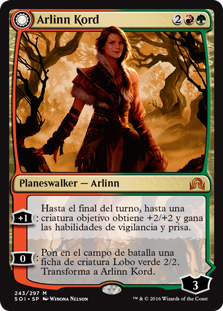 | Rules | +1: Until end of turn, up to one target creature gets +2/+2 and gains vigilance and haste. 0: Create a 2/2 green Wolf creature token. Transform Arlinn Kord. // +1: Creatures you control get +1/+1 and gain trample until end of turn. −1: Arlinn, Embraced by the Moon deals 3 damage to any target. Transform Arlinn, Embraced by the Moon. −6: You get an emblem with "Creatures you control have haste and ': This creature deals damage equal to its power to any target.'" |