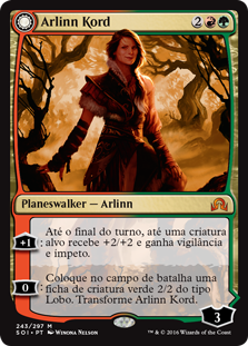 | Rules | +1: Until end of turn, up to one target creature gets +2/+2 and gains vigilance and haste. 0: Create a 2/2 green Wolf creature token. Transform Arlinn Kord. // +1: Creatures you control get +1/+1 and gain trample until end of turn. −1: Arlinn, Embraced by the Moon deals 3 damage to any target. Transform Arlinn, Embraced by the Moon. −6: You get an emblem with "Creatures you control have haste and ': This creature deals damage equal to its power to any target.'" |