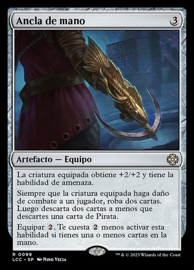 | Rules | Equipped creature gets +2/+2 and has menace. Whenever equipped creature deals combat damage to a player, draw two cards. Then discard two cards unless you discard a Pirate card. Equip . This ability costs less to activate if you have one or fewer cards in hand. |